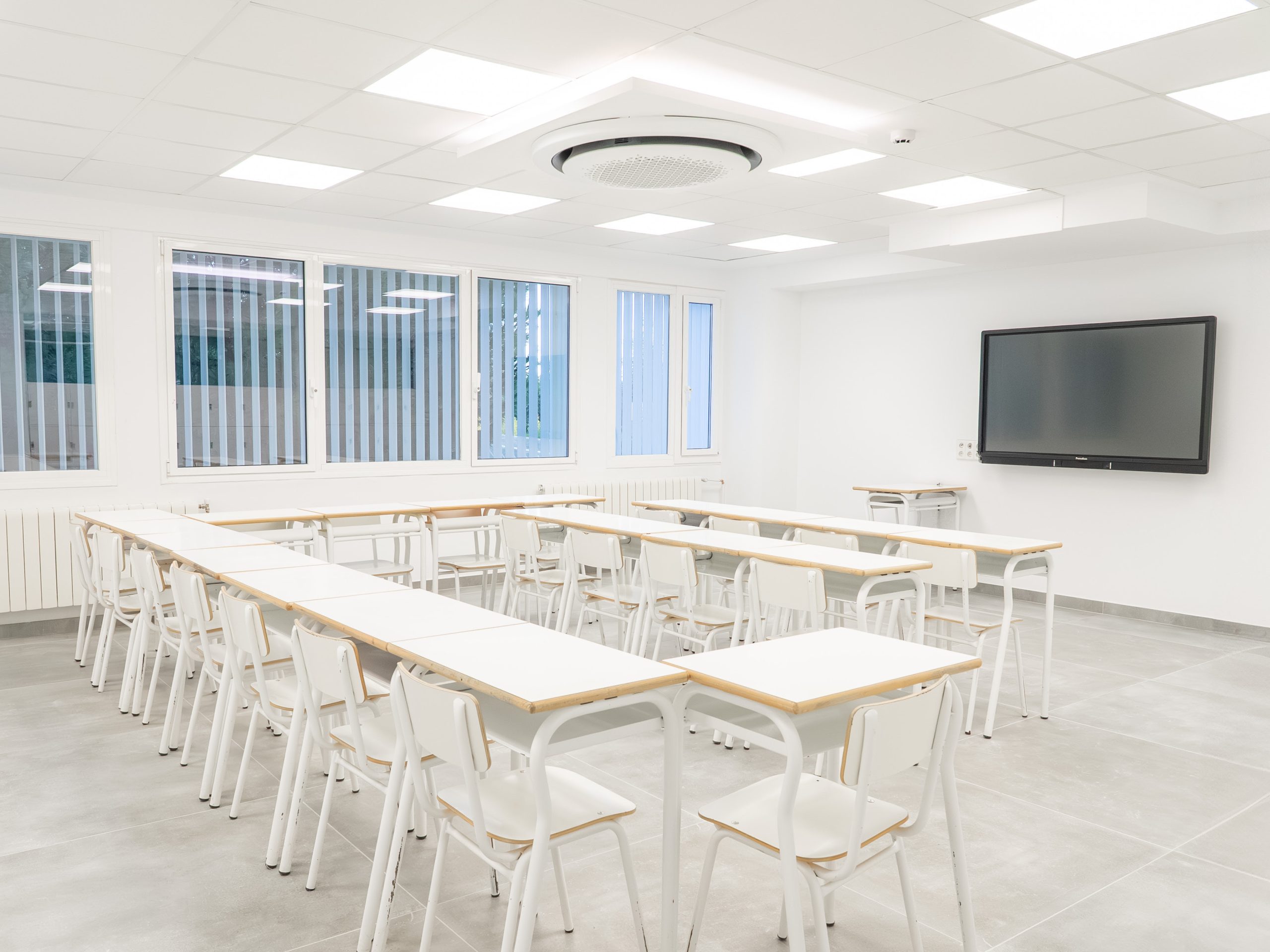 La actuación más relevante de este verano ha sido la transformación integral de la planta segunda del edificio de Bachillerato, con 330 m² de superficie útil y 365 m² construidos, que se suman a las reformas acometidas en fases anteriores. Esta remodelación ha permitido dotar al espacio de aulas modernas y luminosas con cerramientos de cristal, sistemas de climatización independiente, despachos administrativos renovados y doble acristalamiento con ventilación y purificación de aire, garantizando un entorno más saludable, funcional y adaptado a las necesidades actuales del alumnado y profesorado.